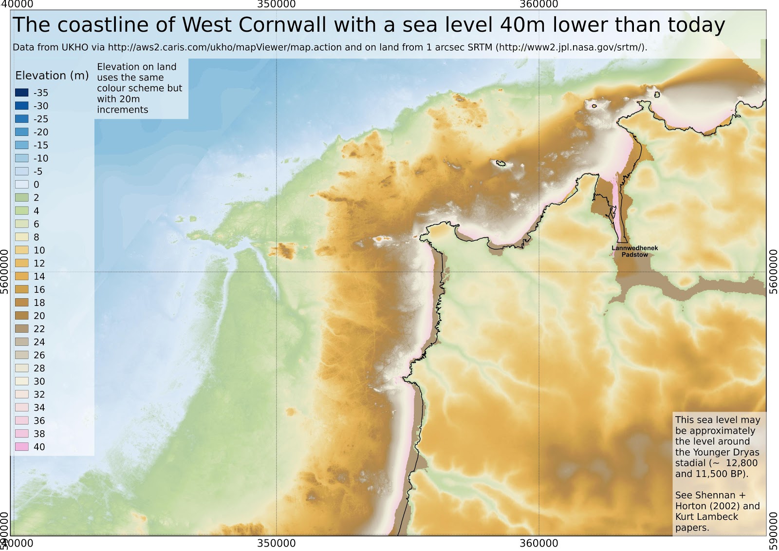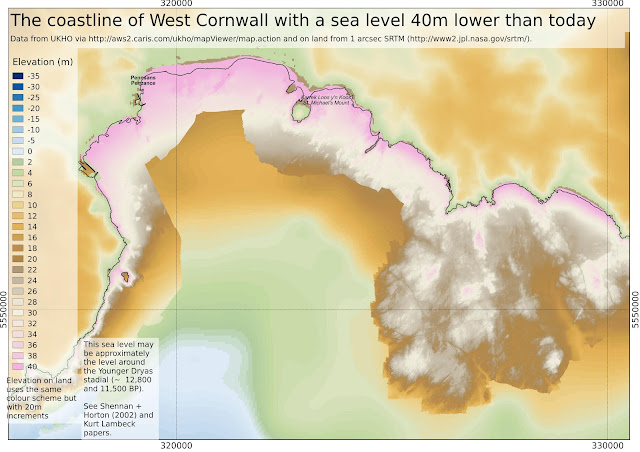 For this reason, and also to not worry about differential post-glacial rebound across the area, I have concentrated on West Cornwall. I have used the same assumptions of it as my previous post on the subject, that is the Shennan + Horton 2002 paper primarily also referring to the work of Kurt Lambeck.