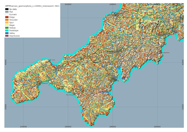 Since then I have become aware of the 1 arcsecond SRTM data being available, so I have recalculated the geomorphons and present some maps of Cornwall here.
