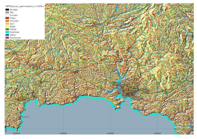 I had originally posted maps of DEMs of Cornwall and the Aberystwyth area of mid-Wales processed using Tomasz Stepinski et al.'s geomorphon method.