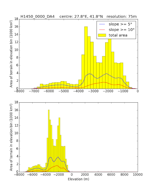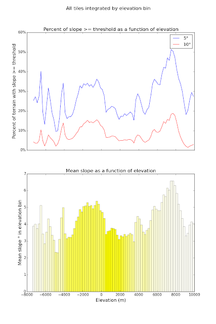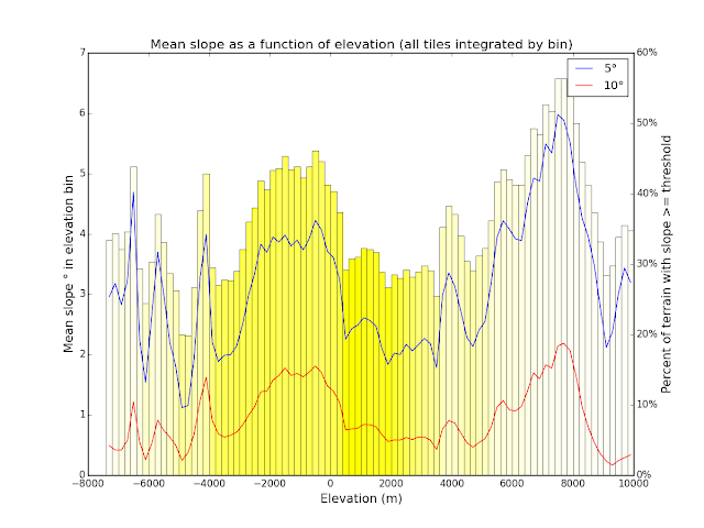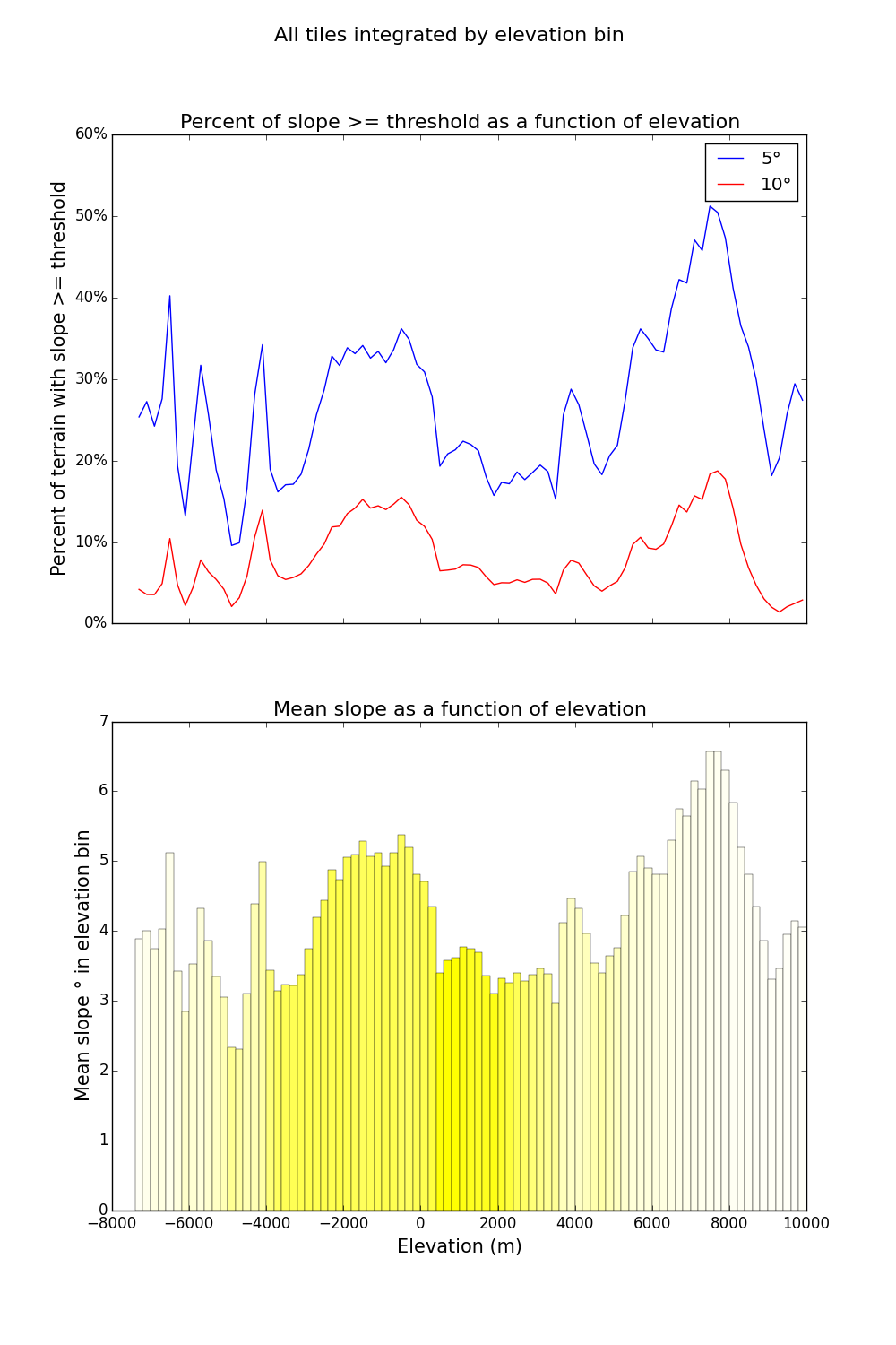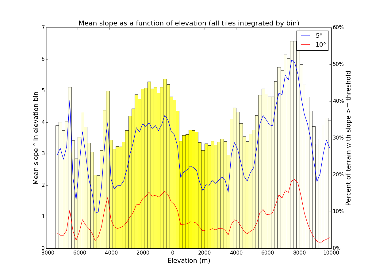 Link to animated version (8MB gif) Mean slope in each elevation bin in each tile, and the % of terrain with slope >= 5° and 10° in each elevation bin. The density of shading depends on the area in each elevation bin, compared with the bin having the largest amount of area.
