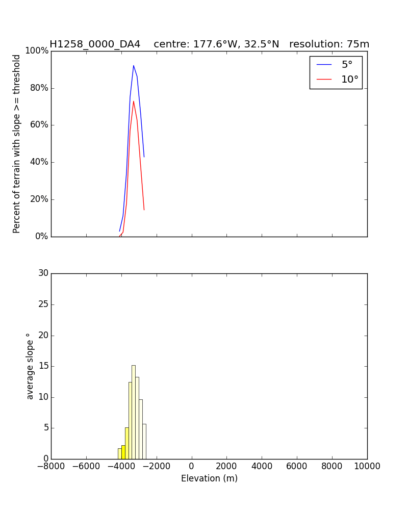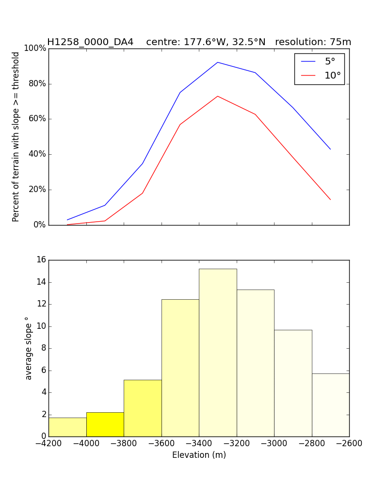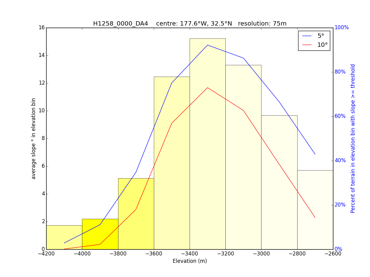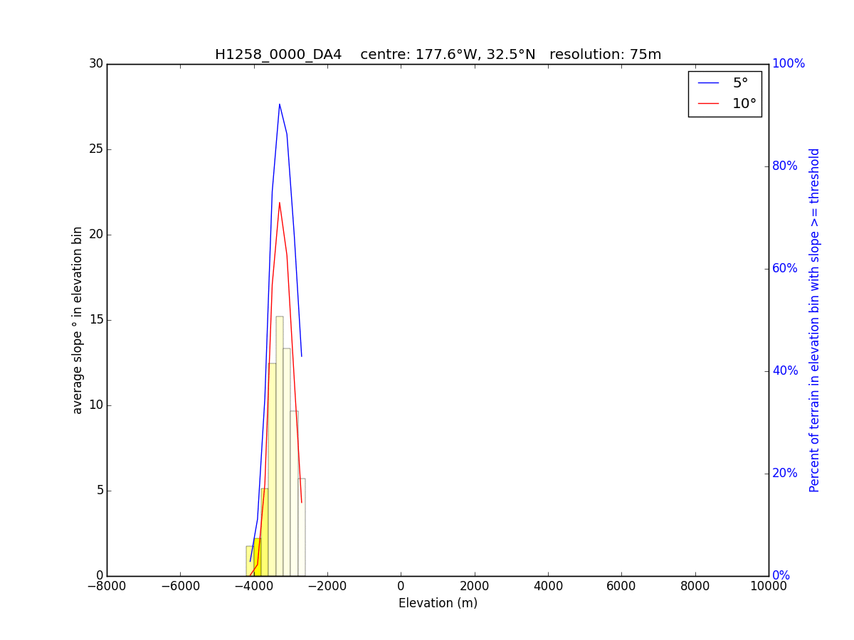 Since there is often a wide variety of elevation within a tile, and the sometimes large north-south extent of each tile, they can encompass a wide variety of terrains, I developed the program to bin the data in each tile into elevation bins, and calculate the mean slope for each bin. I currently use a bin width of 200m in elevation.