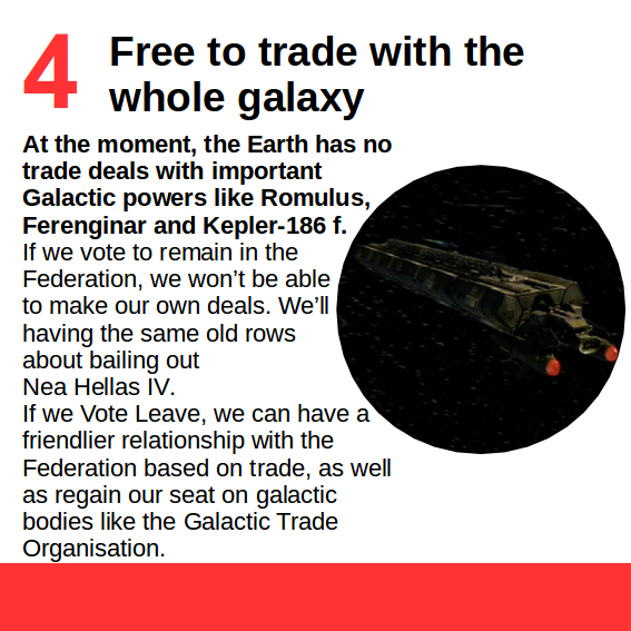 The Prime Minister of Earth, Tresera June still maintains that the planet will not only press ahead with plans to leave the Federation, but leave the UFP single market. The Romulan government is expecting this may give an opportunity to bring an end to trade sanctions imposed by the Federation after the Romulan annexation of two star systems in the Neutral Zone. This could even lead to the legalisation of Romulan Ale on Earth. However this would mean a hard border with Mars and its dependent asteroid colonies which will be remaining in the Federation, and the possibility of another independence referendum on Luna.