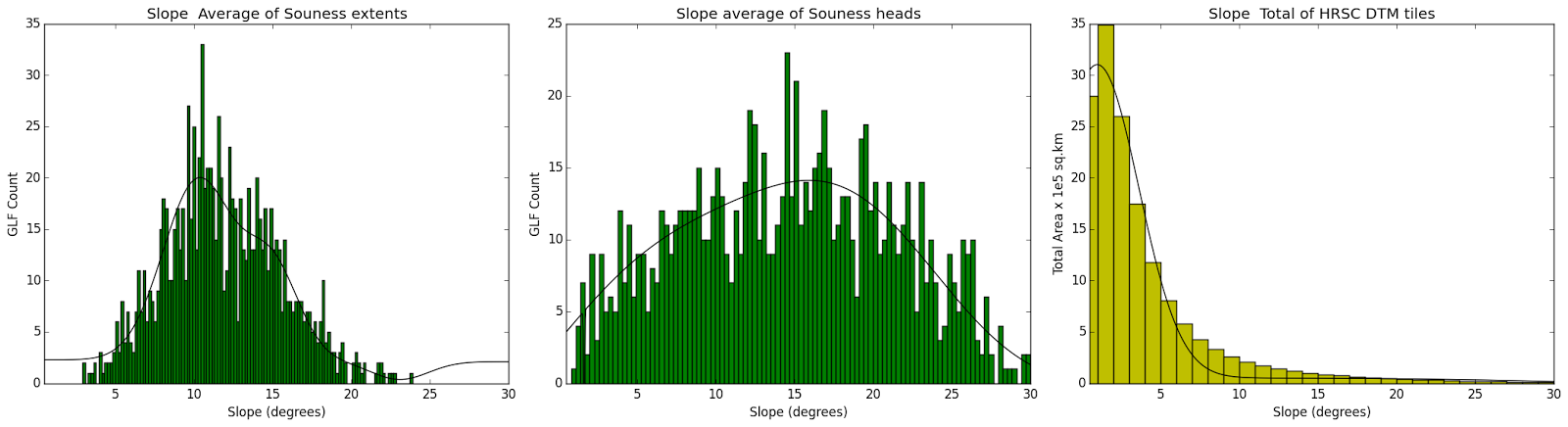 What will be needed however is the histogram of slope as a function of elevation. Below is a table of 179 HRSC DTM tiles that contain coverage of Souness objects, detailing mean, minimum and maximum elevation and slope, etc. A more comprehensive statistical assessment would use all HRSC DTM tiles that exist in the latitude range 25° - 70° that Souness studied.