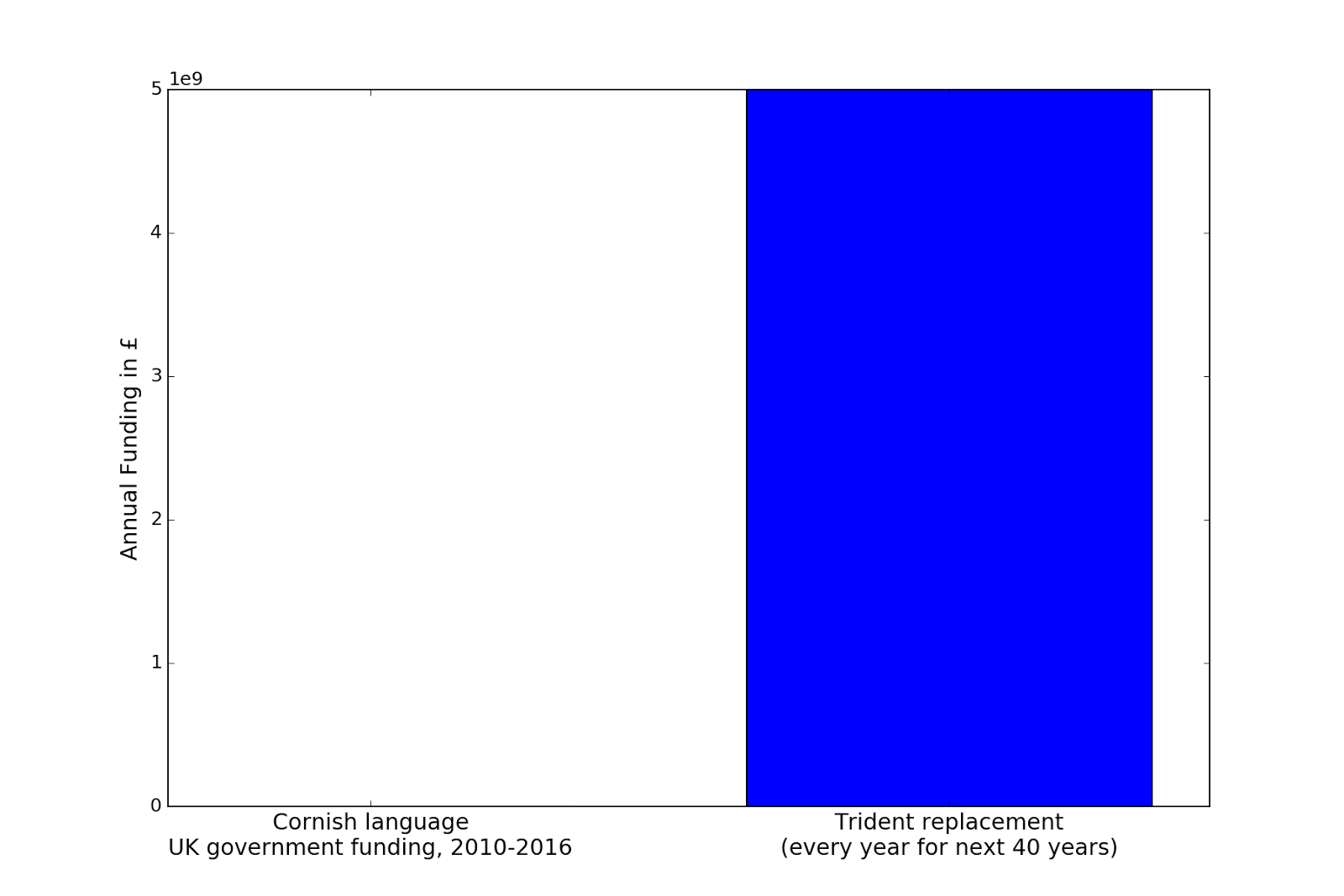 The blue bar is 1200 pixels high in the original image therefore the left hand bar (£108333.33/yr based on £650000 over 6 years) is not even visible in the rendering. It should also be noted that the UK government has funded nuclear weapons since the 1940s whereas the £650000 in 6 years represents the entirety of the UK central government funding for Cornish over more than 300 years since the 1707 Act of Union. |