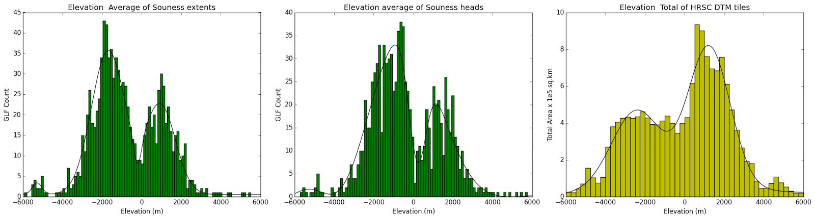 The outliers at the extreme ends of the elevation distribution may be of interest, since they may show something about what limited the distribution of Souness objects on Mars.