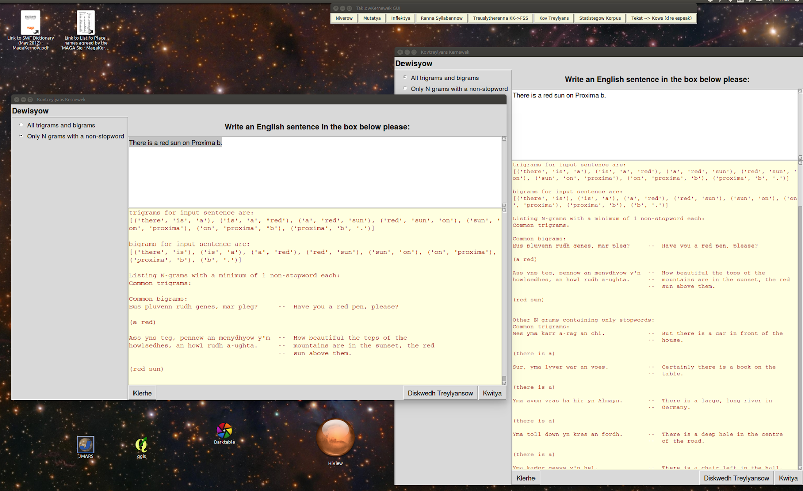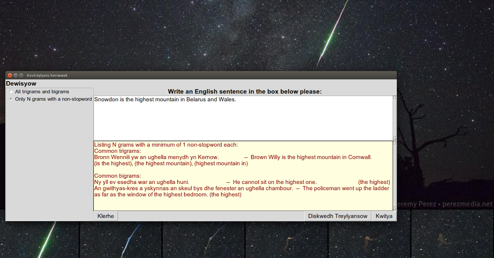 What the program does is to ask for an input sentence (currently only via the command-line) in English, and then find the 'bigrams' and 'trigrams' in it, and also do so for the sentences from Skeul an Yeth 1.