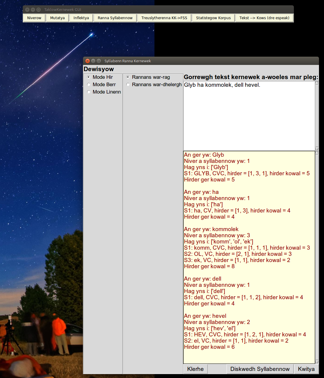 The other change is the y becoming an e as part of vocalic alternation. This occurs for y vowels that are 'half-long' in Kernewek Kemmyn, which is detected via the syllable segmentation program.