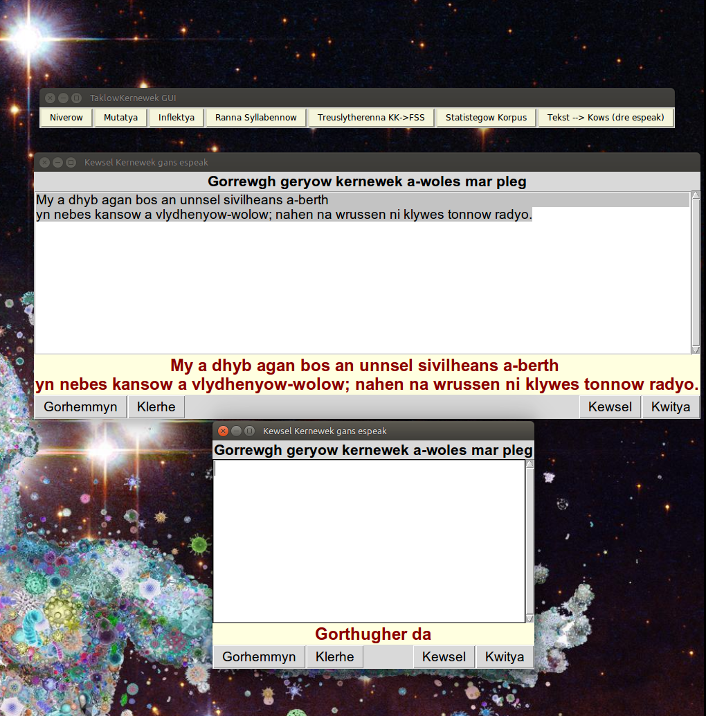 I have added recently a number of things to them, including reverse mutation, and a launcher program. In this post, I will describe a little of 'Niverow', a program to write out numbers in Cornish, 'Mutatya' - a program to generate mutated forms of words, and 'Inflektya', a program to generate inflected verb forms.
