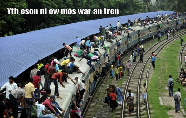 A typical summer Saturday on the main train line through Cornwall. In Cornish it is not recommended to use "war an tren", instead "y'n tren" if you are indeed travelling inside the carriage. |