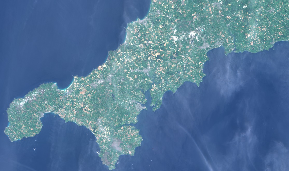 A composite of bands 2, 3, and 4 (not atmospherically corrected) showing west Cornwall. |