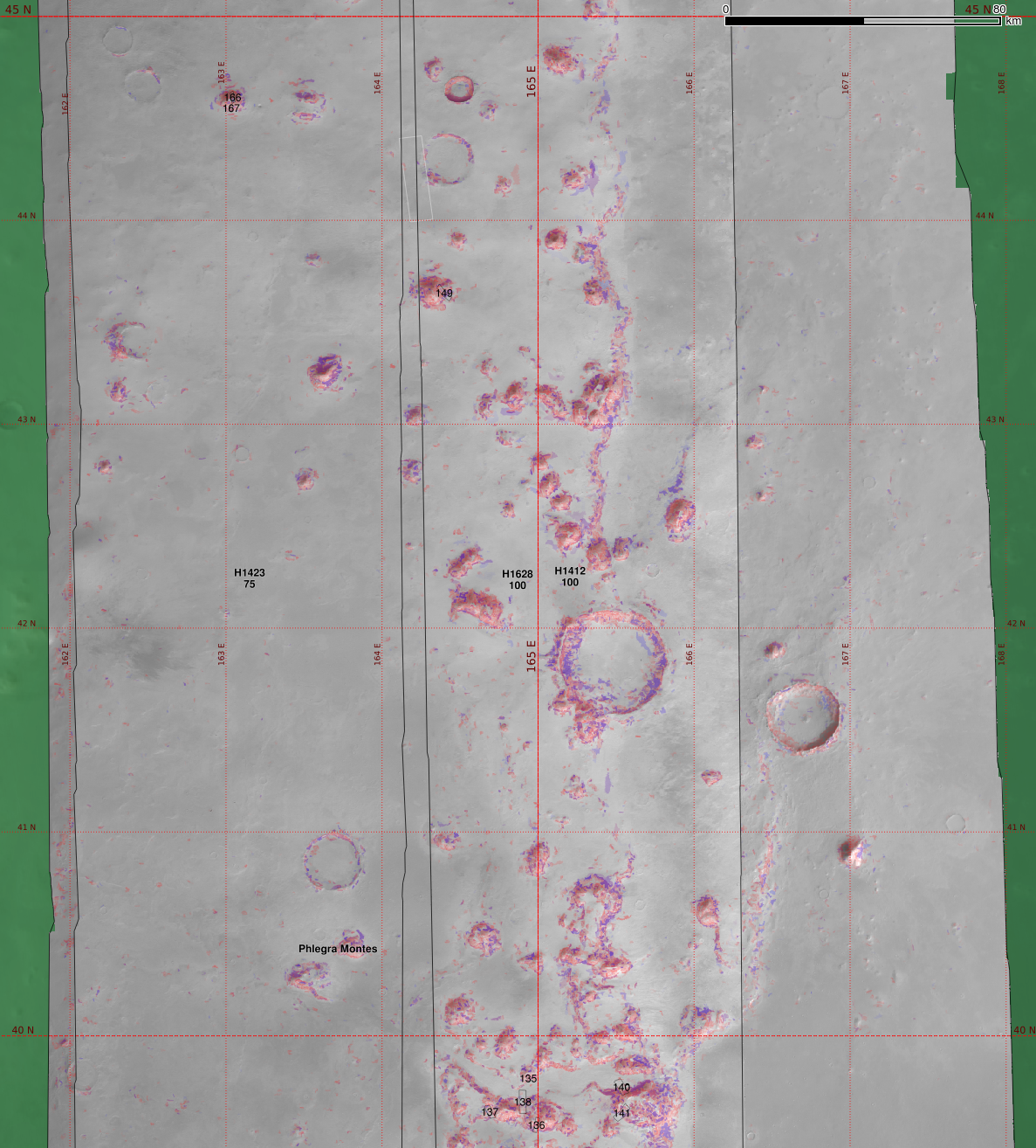 In the final instalment of my posts giving a summary of the northern mid-latitudes of Mars, I will present the Phlegra Montes area, in the easternmost part (if you're working with -180 to 180° longitudes as I am) of the northern hemisphere.