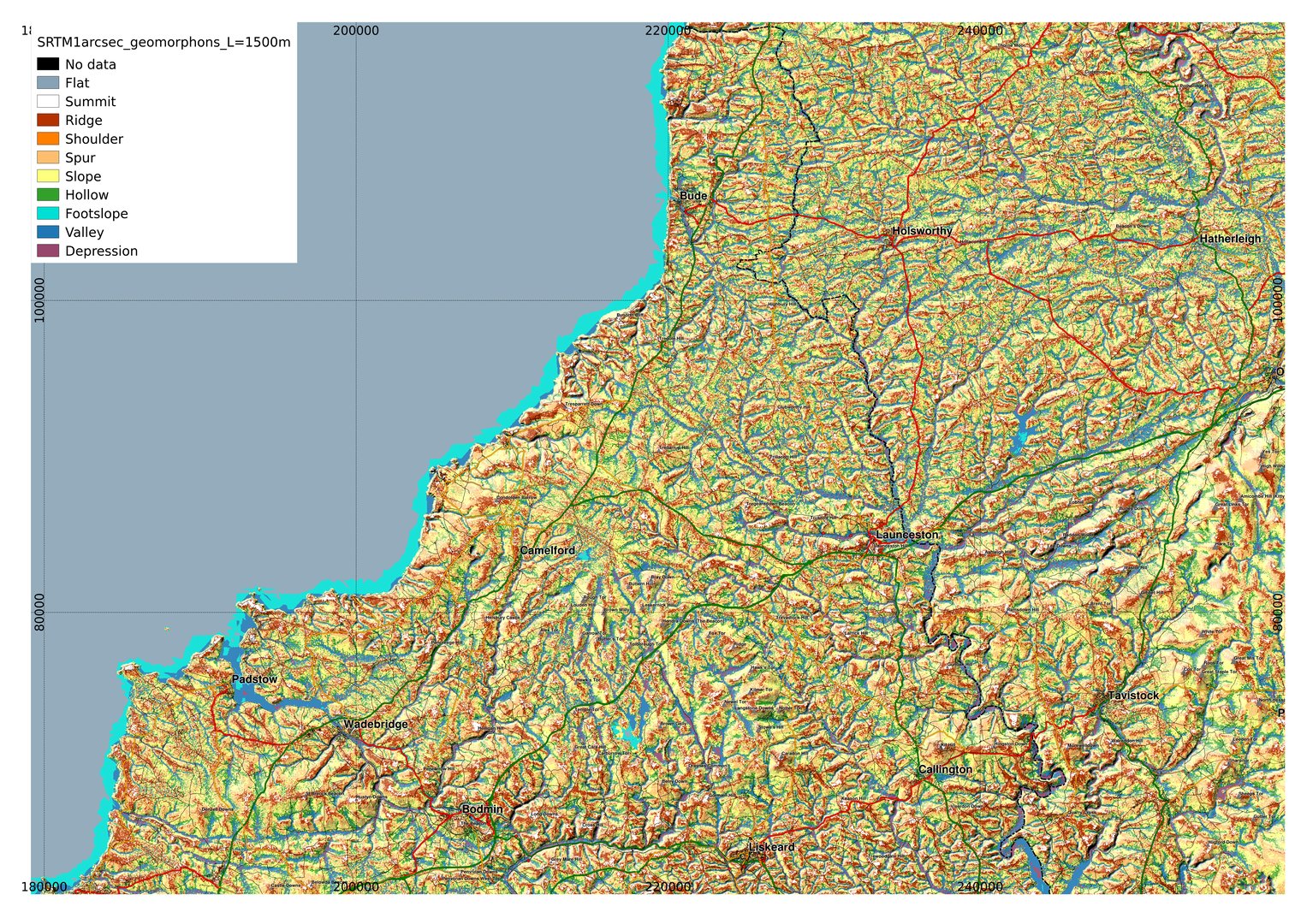 Since then I have become aware of the 1 arcsecond SRTM data being available, so I have recalculated the geomorphons and present some maps of Cornwall here.