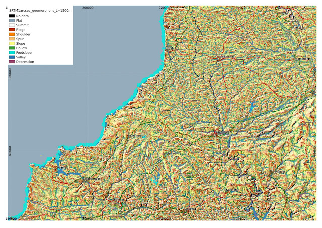 I had originally posted maps of DEMs of Cornwall and the Aberystwyth area of mid-Wales processed using Tomasz Stepinski et al.'s geomorphon method as descibed in the papers of: Stepinski+Jasiewicz 2011, Jasiewicz + Stepinski 2013.