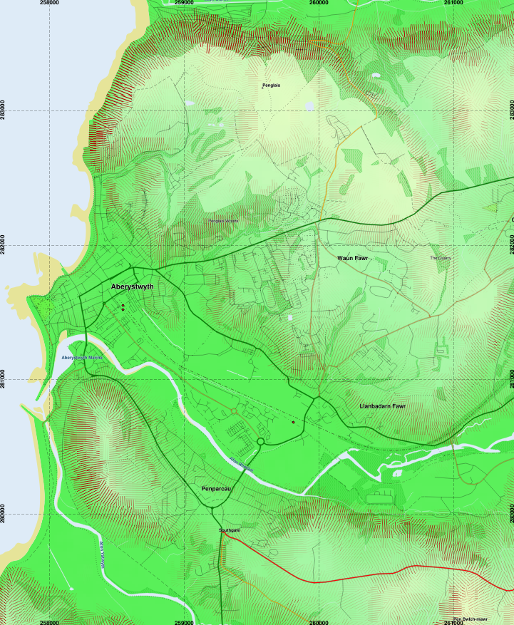 A map of Aberystwyth using lines along slope direction to indicate slope