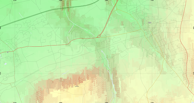 Here is a version, with the roads added from OpenStreetMap, and inland and tidal water added from OS VectorMap, rendered at 1:25k with a modified spacing of slope lines which now are removed entirely where the mean slope in a segment is less than 2.25 degrees (1 in 20), and plotted in a shade of red in an effort to avoid confusion with minor roads. The segment boundaries are also no longer plotted.![]() |