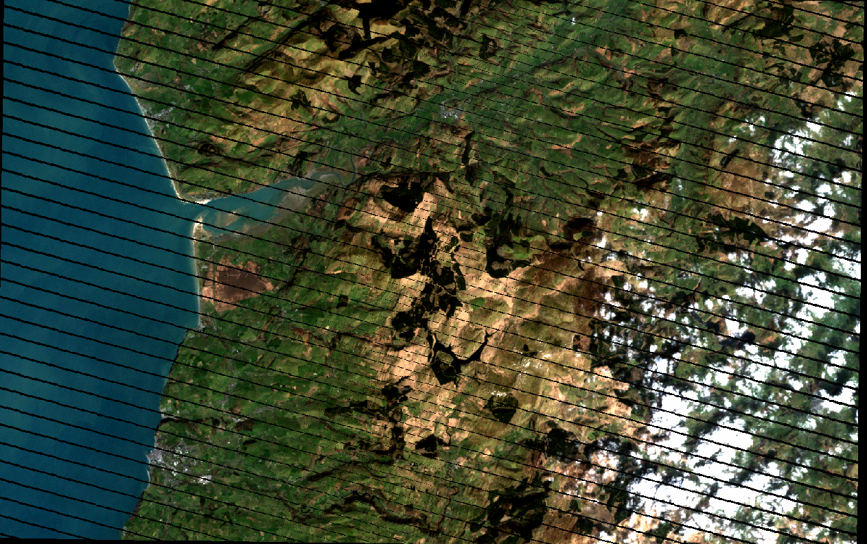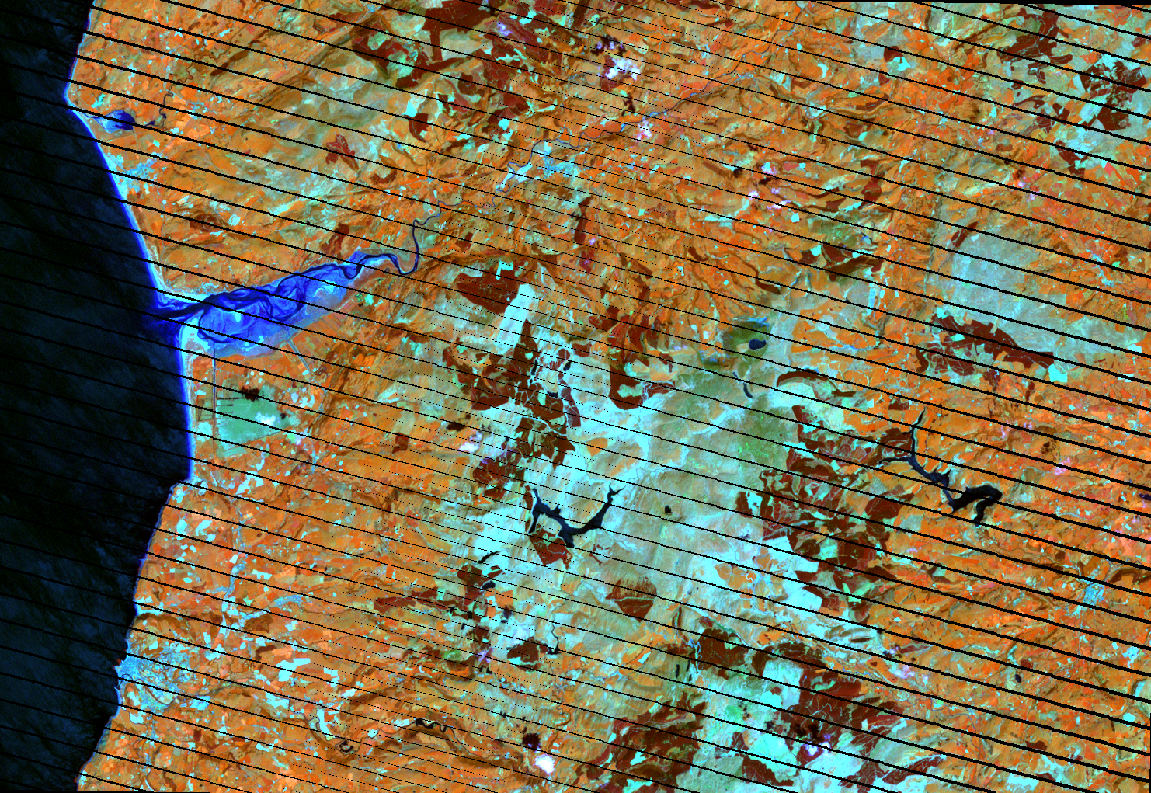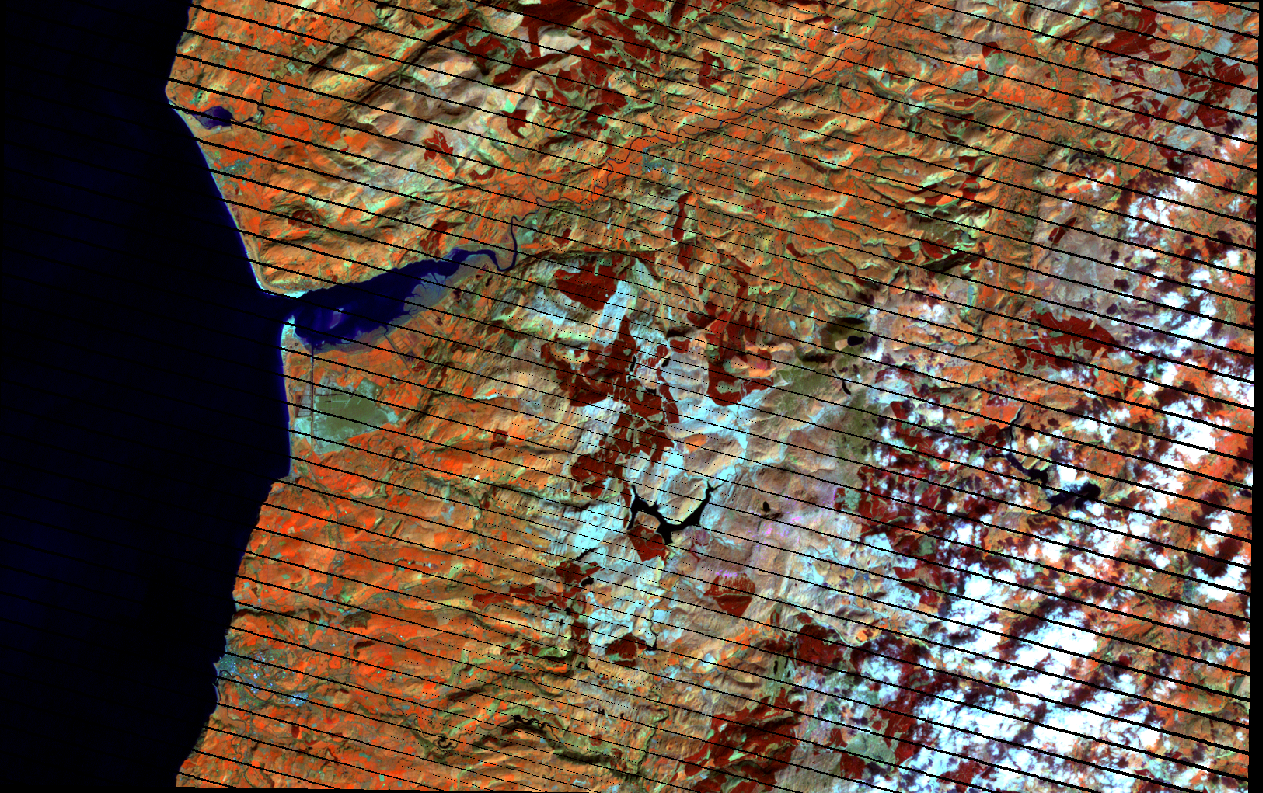 We were set the images from Landsat 7 from March 2007 and June 2006 to work from, and I additionally used a Landsat 8 image from September 2013. Landsat 7 developer a scan line corrector fault. which resulted in black stripes where no data was collected.