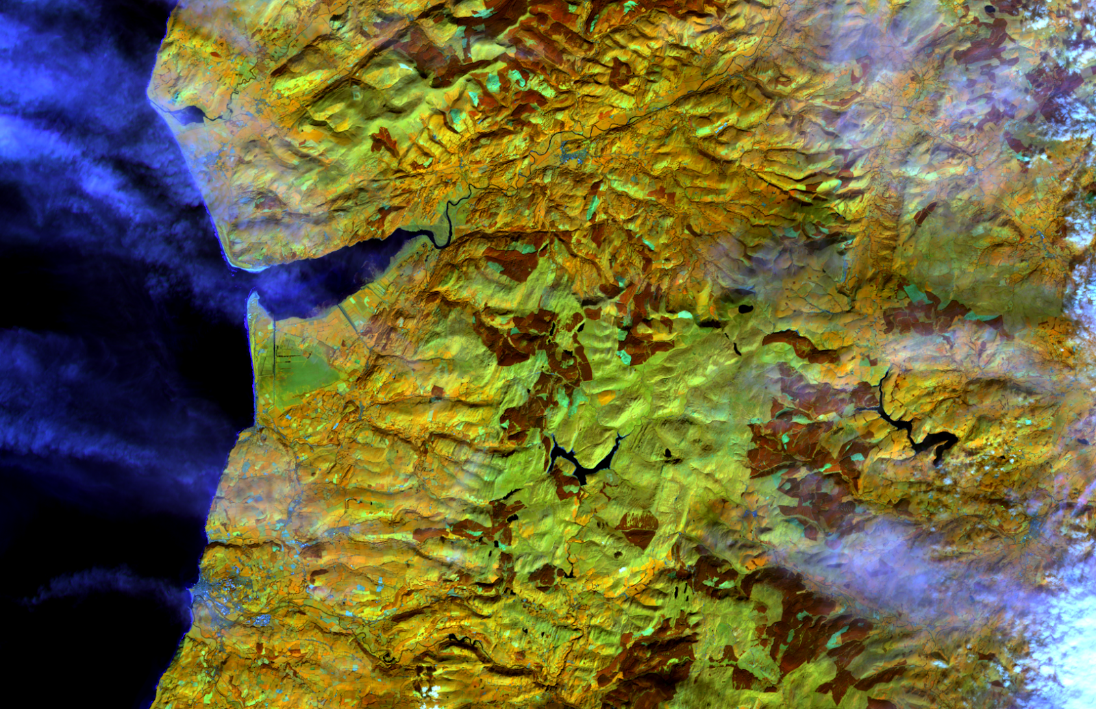 | Landsat 8: 24th September 2013, bands 5, 6 and 4 (NIR, SWIR1, red) as RGB. |