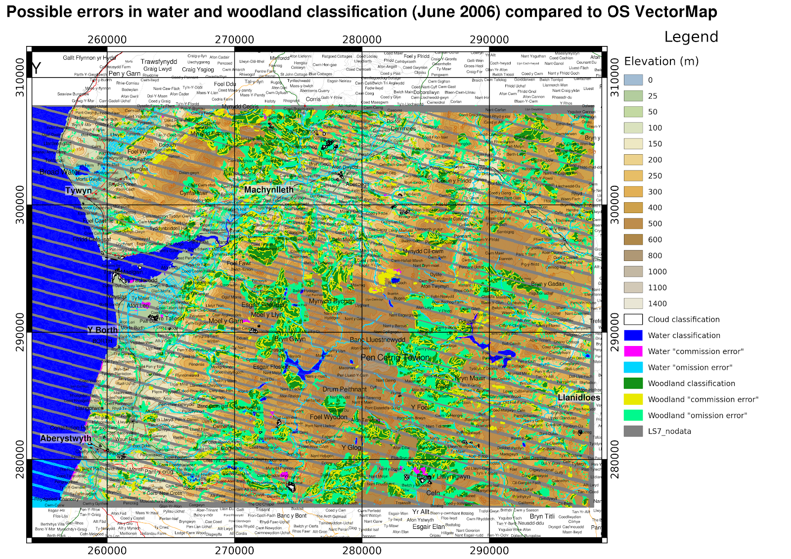 | large version There are a few areas of cloud shadow and other areas falsely classified as water. In addition there are some areas of cloud which may not be real. The woodland is generally underpredicted relative to OS VectorMap, the "omission error" areas are often classified as "Mosaic". |
