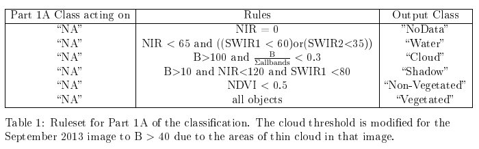 The ruleset I first developed on the March 2007 image because that had areas of cloud and therefore an opportunity to get the cloud masking right first.There are three stages to the process, first the Level 1A classification that delineates water (by low NIR and SWIR brightness), cloud (by high levels in the blue band), shadow (by thresholds in Blue, NIR, and SWIR1), and non-vegatation (by normalised differential vegatation index (NIR, R)).