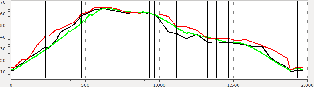 Unfortunately the LiDAR has some wildly oscillating values, particularly around 400m from start where the road is in a cutting near the top of Chapel Hill. I have therefore done a moving average smoothing to make them more comparable.