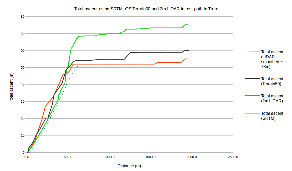 The total ascents were 52m, 55m, 60m, and 75m respectively for the smoothed LiDAR, SRTM, Terrain 50, and unsmoothed LiDAR respectively.