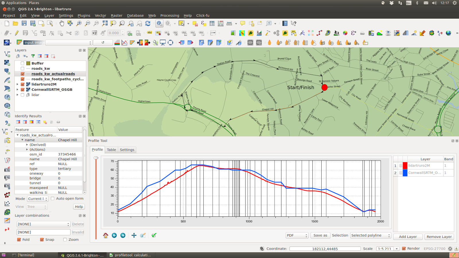 Using QGIS profiler plugin to compare 2m resolution LiDAR vs SRTM