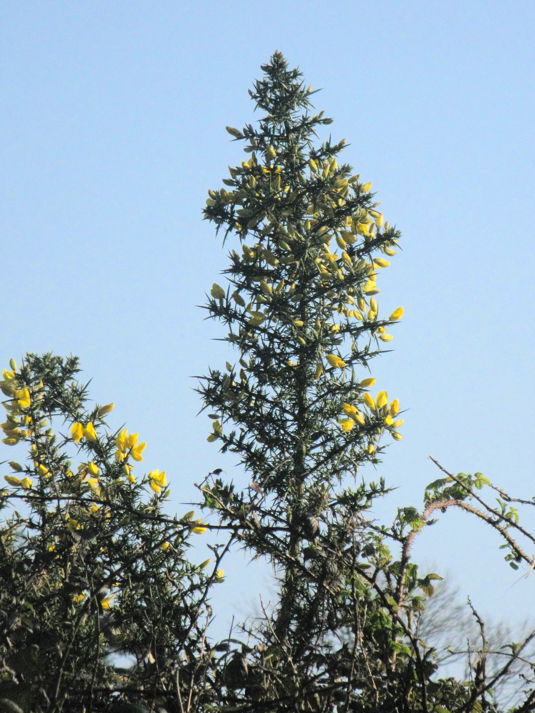 A hedge with brambles among other plants. The brambles still show last year's leaves along with this year's growth |