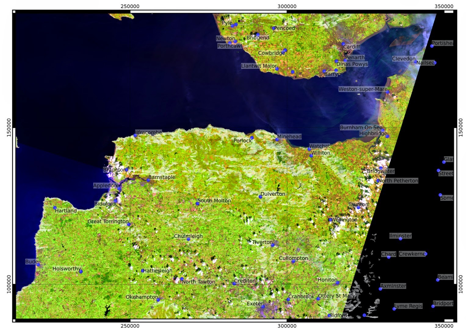 Sea level is based on Shennan and Horton 2002, with a triangular interpolation. Background is Landsat 8 from 25th July 2014. OSGB numerical coordinates.
