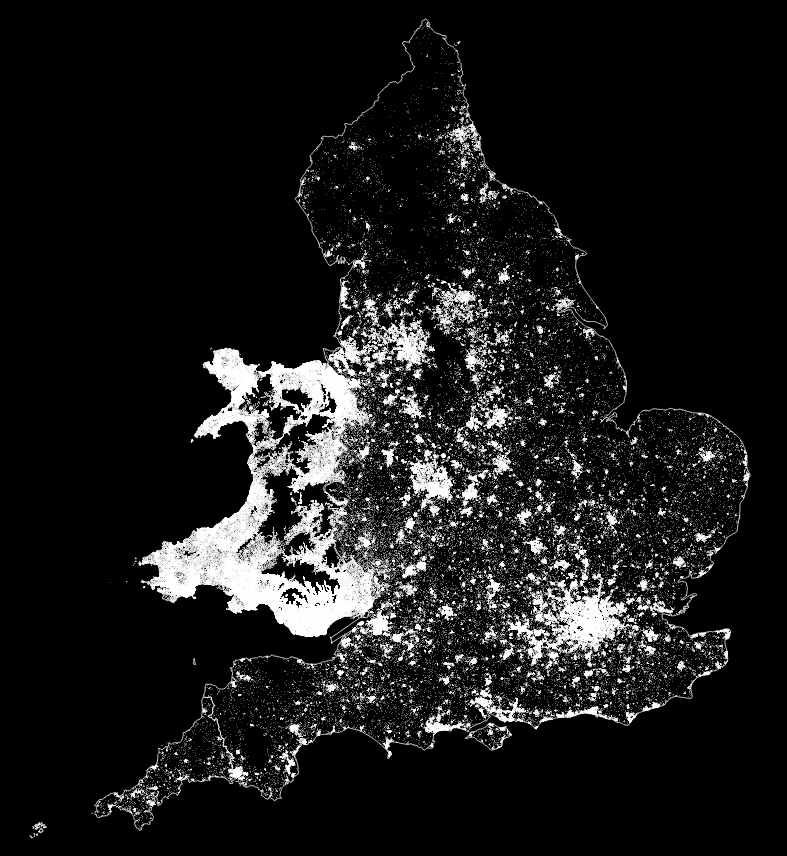 This produces the following dot maps, giving each Welsh speaker 50 metre and 20 metre diameter circles of land respectively: