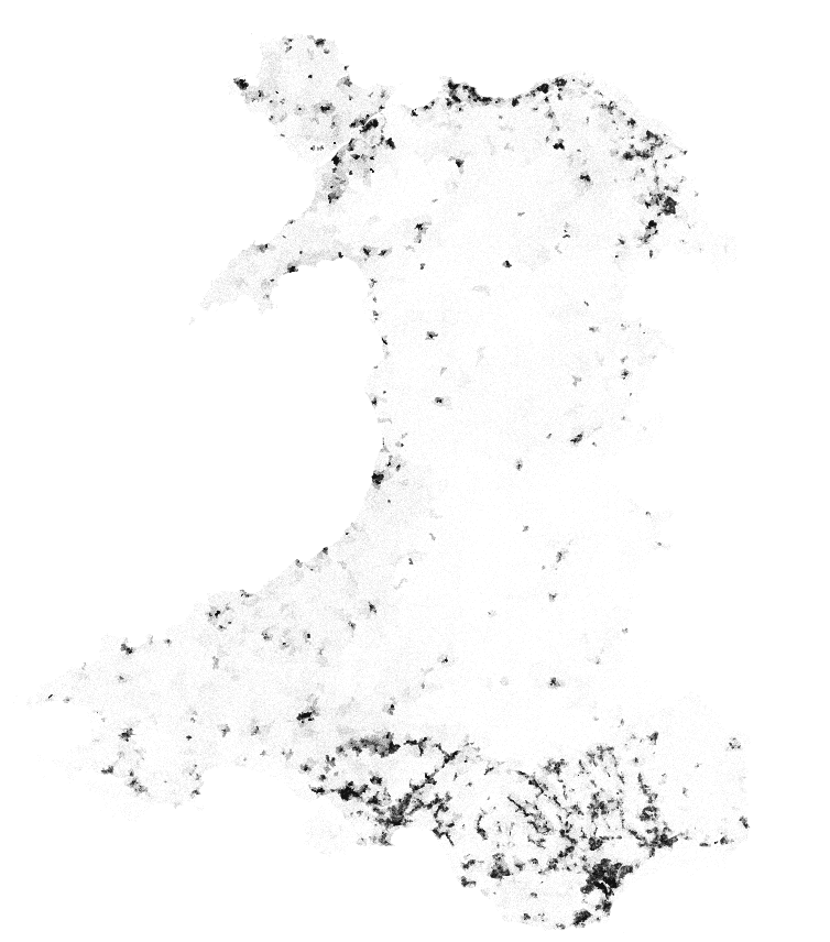 I also downloaded the OS OpenData buildings layer for the relevent grid squares covering Wales, and produced another dots distribution (this took QGIS some time).
