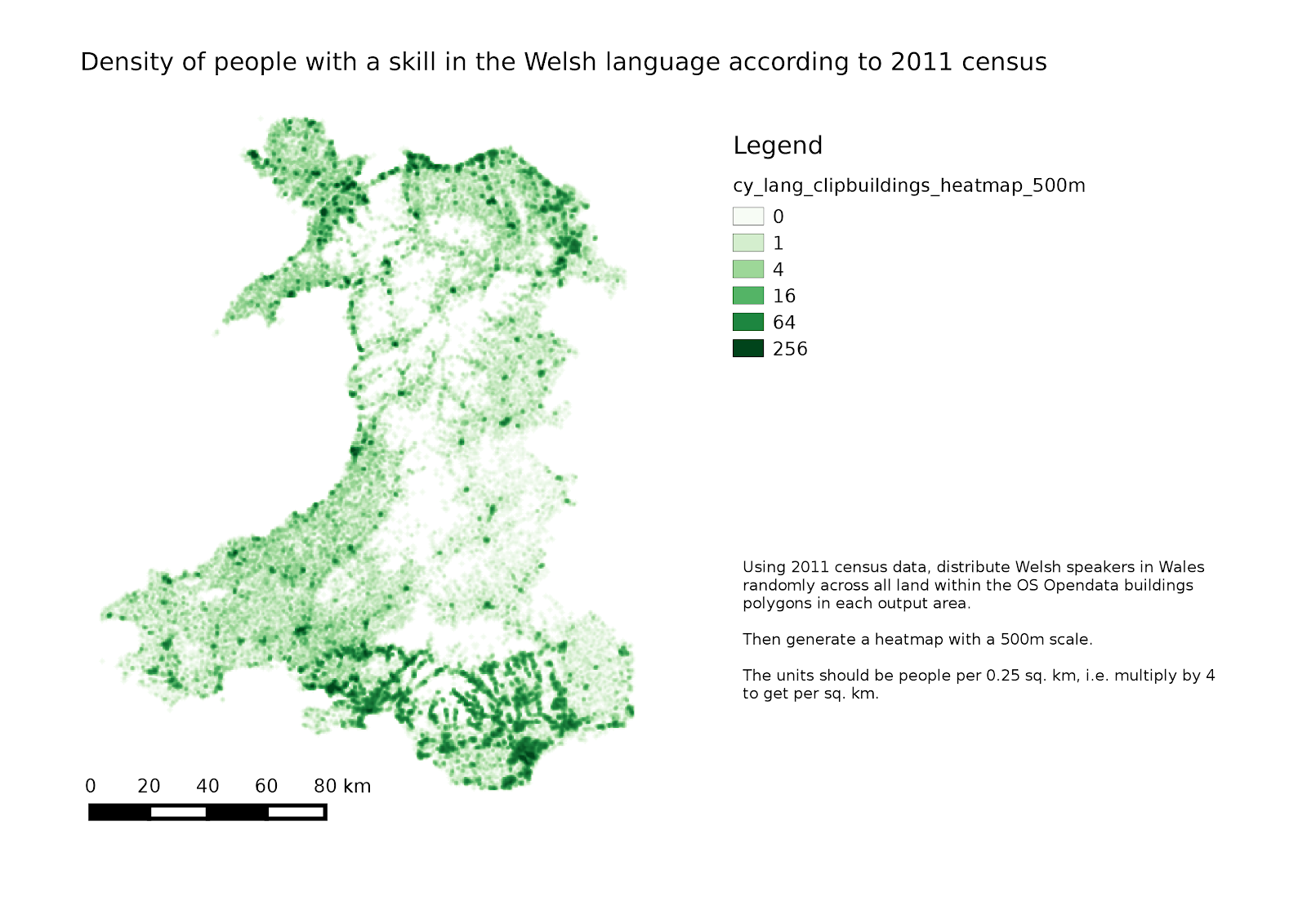 One way is the restriction of the census output polygons to where buildings exist as the Datashine project did. However their website does not display statistics for Welsh language skills, since the detailed question was not asked to census respondents living outside Wales.