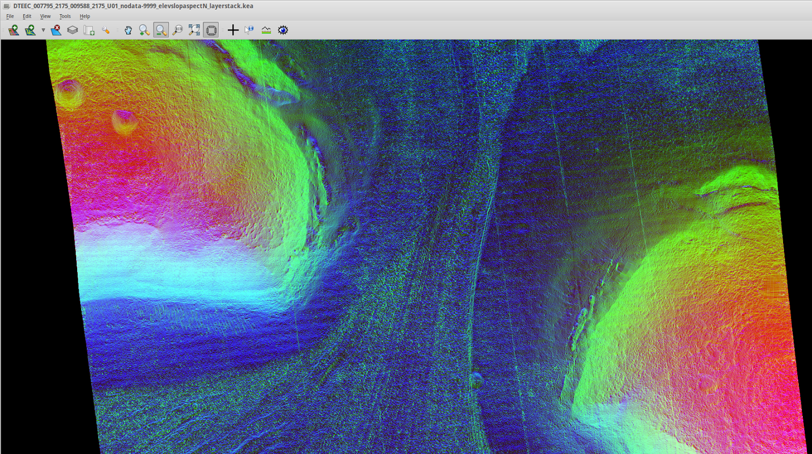 The elevation range is from -2681 to -1997 metres relative to Mars datum, and I've coloured slope in the range 0-30 degrees, and aspect 0-180 deg away from N.