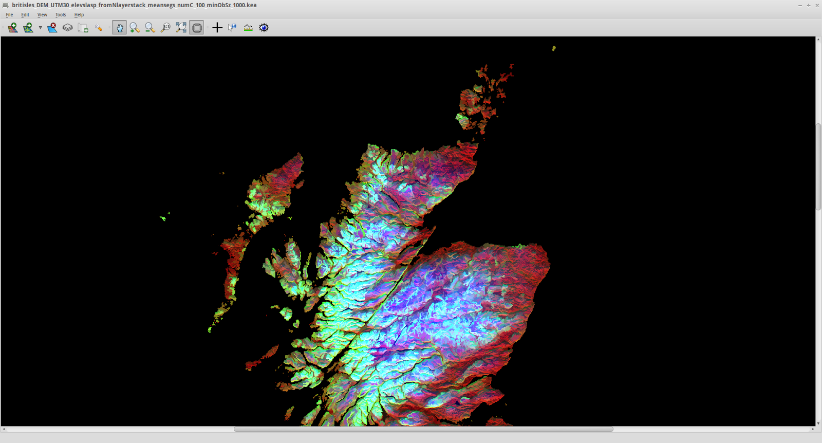 Following on from my last post, here is the topography of the British Isles segmented using RSGISLib using a minimum object size of 65536 pixels.